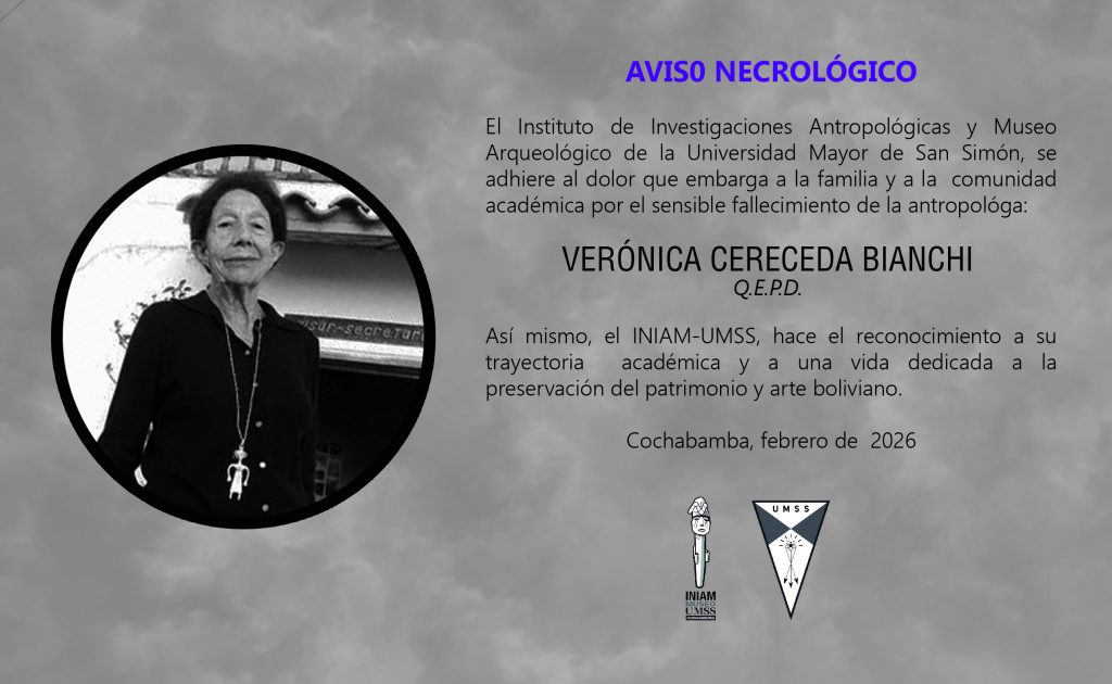 El Instituto de Investigaciones Antropológicas y Museo Arqueológico de la Universidad Mayor de San Simón, se adhiere al dolor que embarga a la familia y a la comunidad académica por el sensible fallecimiento de la antropológa: